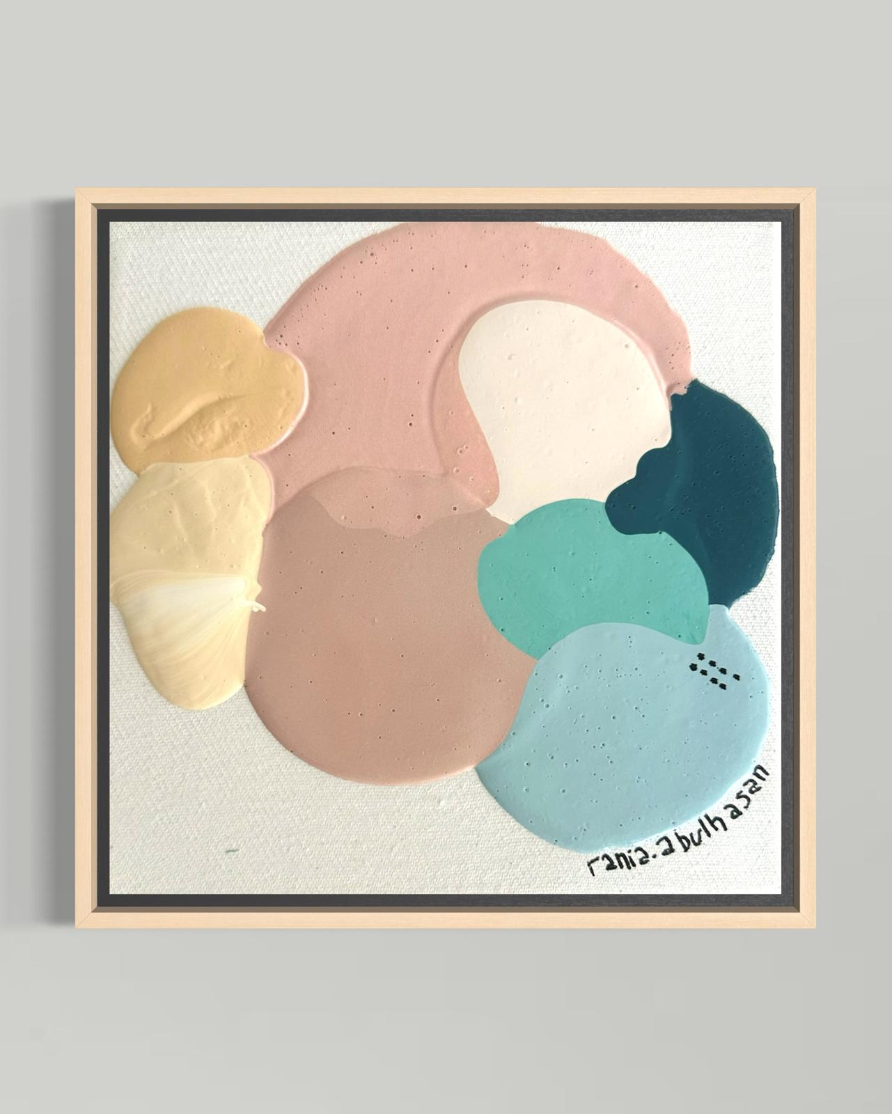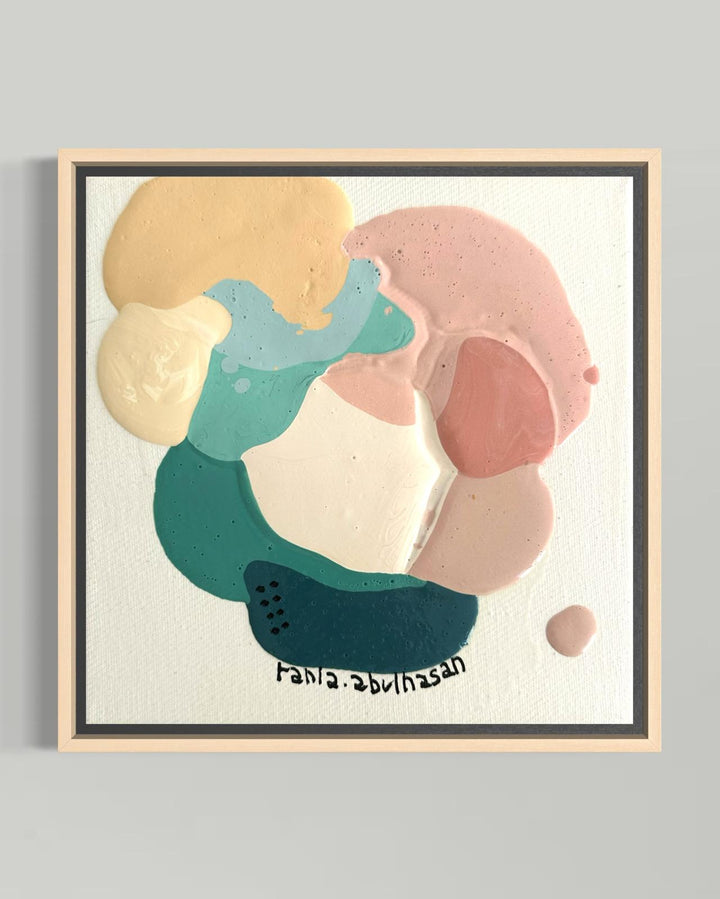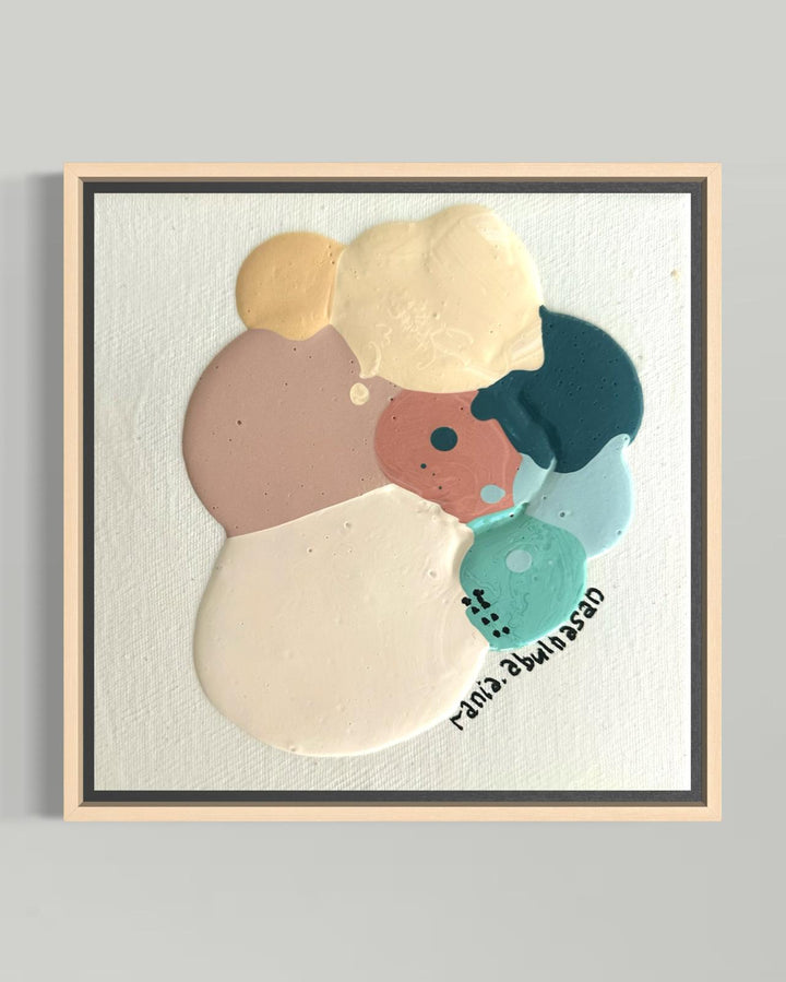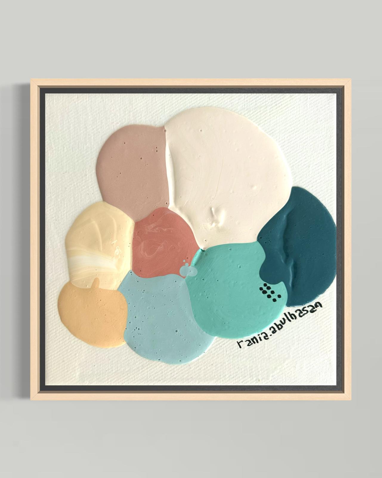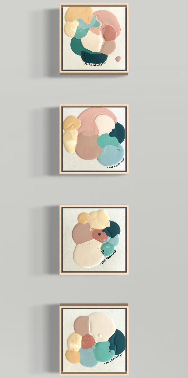 4 Mini Works from the ''Poured Whispers'' collection from 3 PLUS 5 DOTS by internationally acclaimed artist Rania Abulhasan.