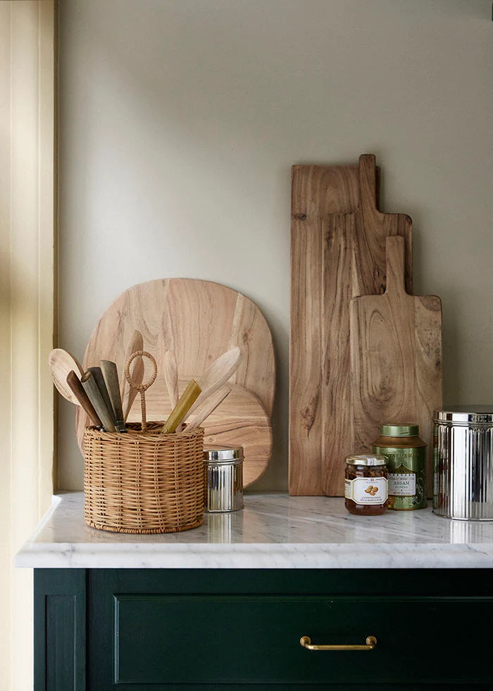 Hand-carved acacia wooden spoon. Our Caya series of spoons, cutting boards, and trays are hand-carved in India and made from 100% acacia wood. The silky-smooth collection is untreated, highlighting the wood's natural and raw beauty. You can use the wooden items as they are, or treat them with a natural food-safe oil, such as olive or rapeseed oil, to achieve a deeper and more rich color.