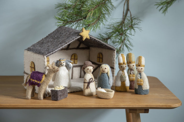 The set includes 9 handmade figurines including the Three Kings, baby Jesus, Mary and Joseph, an Angel, a Camel with Hay plus a lovely Stable which can be used as a sweet box to safely pack away your nativity set each year. The figurines are also suitable as finger puppets for the little ones.