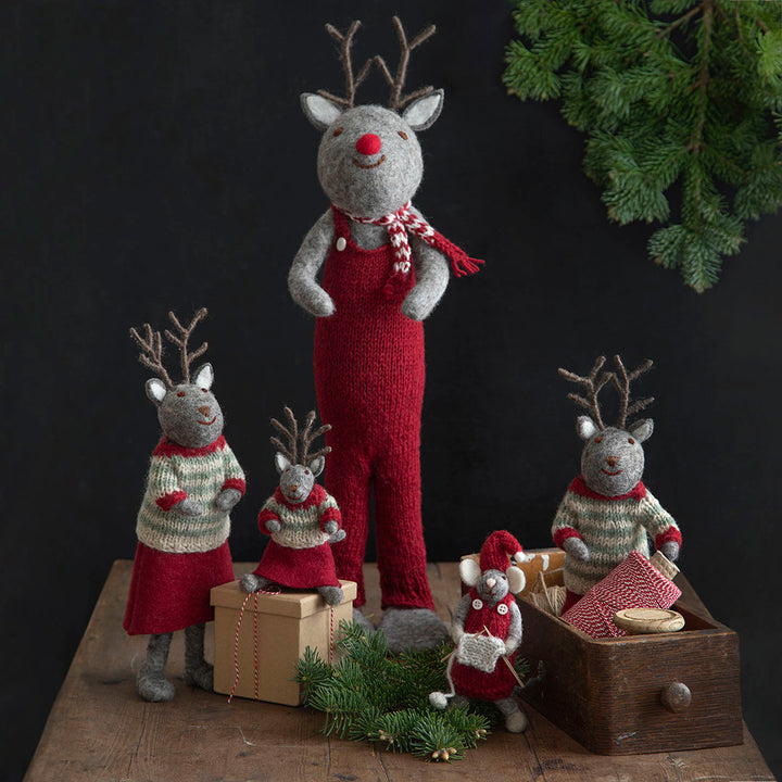 Wearing a soft sweater and skirt, this small grey girly deer is ready for a cozy winter. A delicate handcrafted addition to the Reindeer Family.