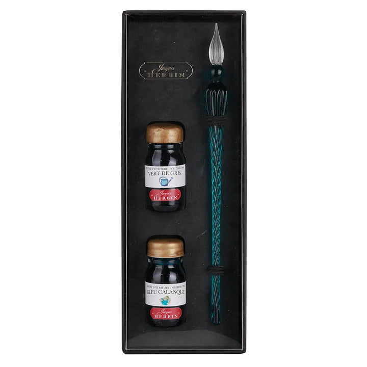This elegantly finished gift box contains a glass nib and 2 10ml writing inks. Each stopper is hand-waxed in the Jacques Herbin workshops. 1 emerald glass nib, 1 Vert de gris ink and 1 Bleu calanque ink. Made in France.