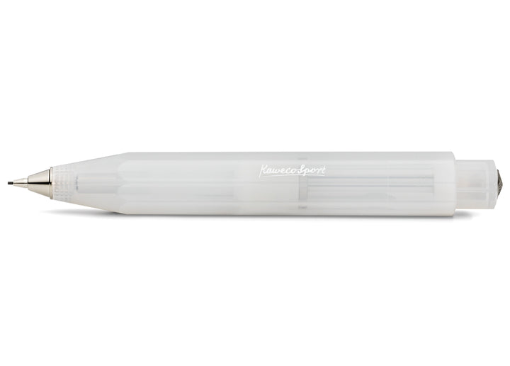 The writing instruments of the Frosted Sport series come in fresh, pastel colours and are characterized by a slightly opaque, milky plastic. The series gives the classic Kaweco Sport a completely modern touch. Matching the cool shades, the elements, such as the logo cap, were kept in silver. The mechanical pencil with a line width of 0.7 mm is perfect for sketching ideas and drawing. Due to the push mechanism, the refill is never dull and therefore perfect for travelling, as you never have to re-sharpen it. The wide barrel protects the lead from cracking.
