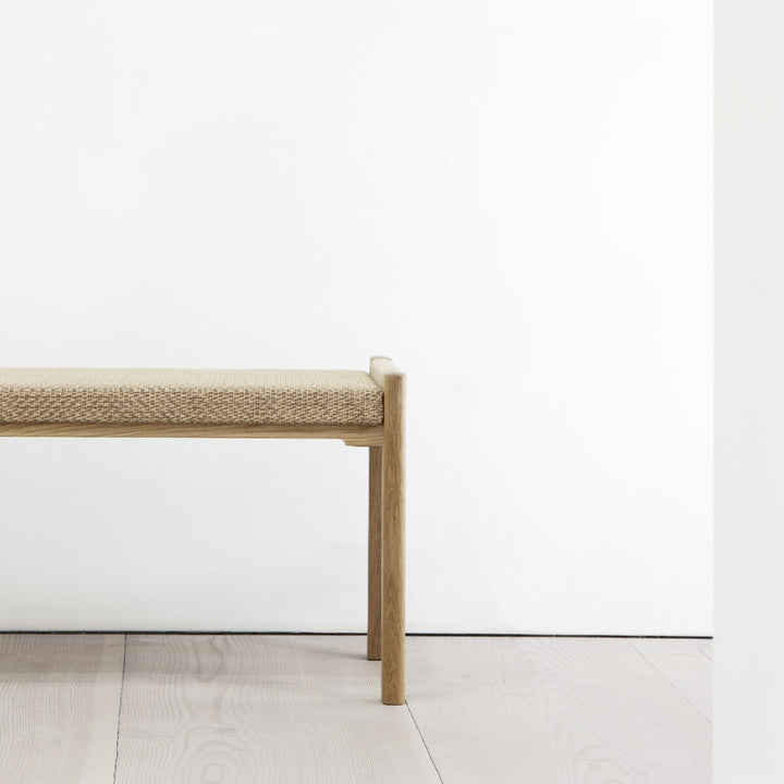 Detalji is made of sustainably grown solid oak. The wooden surface is treated with natural wood oil mix, which doesn’t harm the craftsman, environment, or the user, and the paper yarn is spun and woven in Ostrobothnia, Finland. The upholstery material is 100% wool. Together the delicate details of the Woodpecker paper yarn fabric and the joinery solutions of solid wood make the bench inviting and suitable for various surroundings.