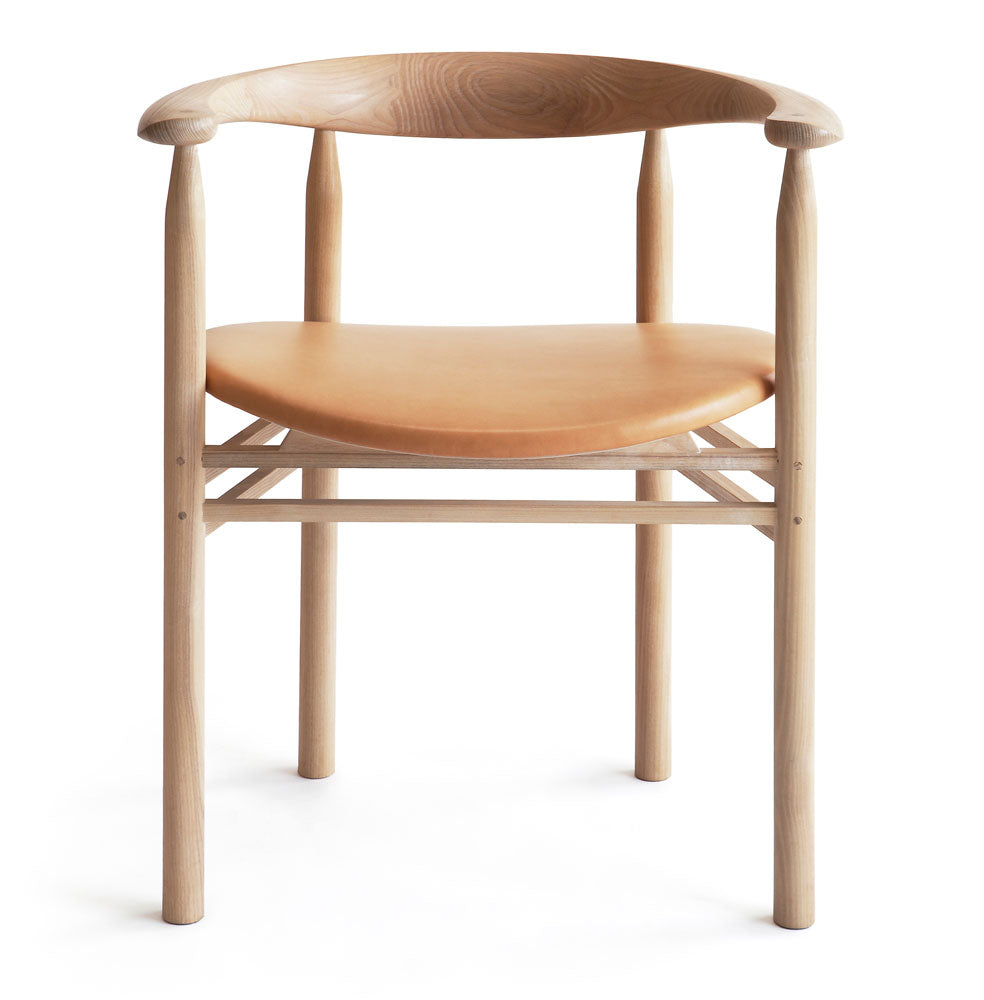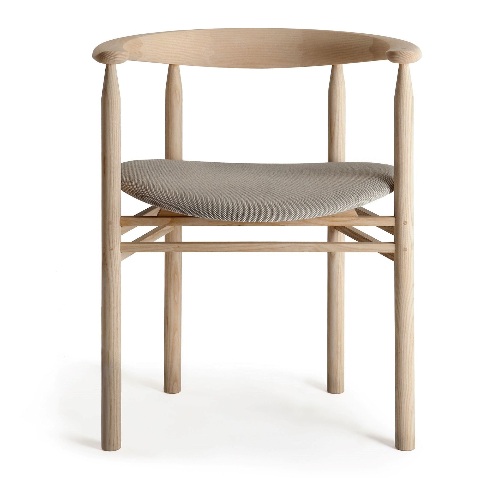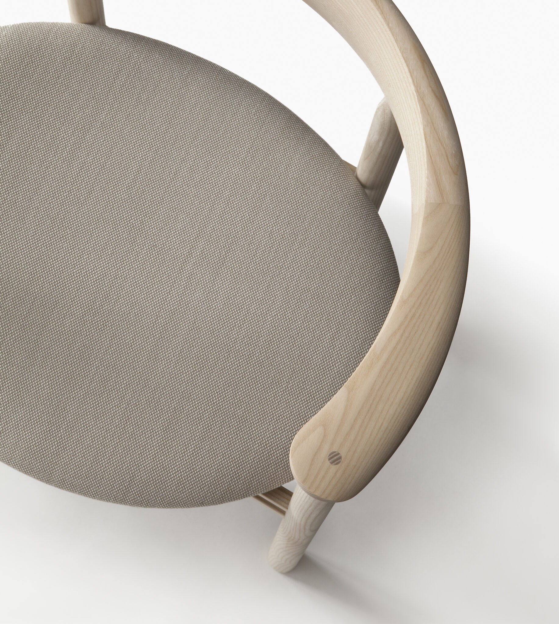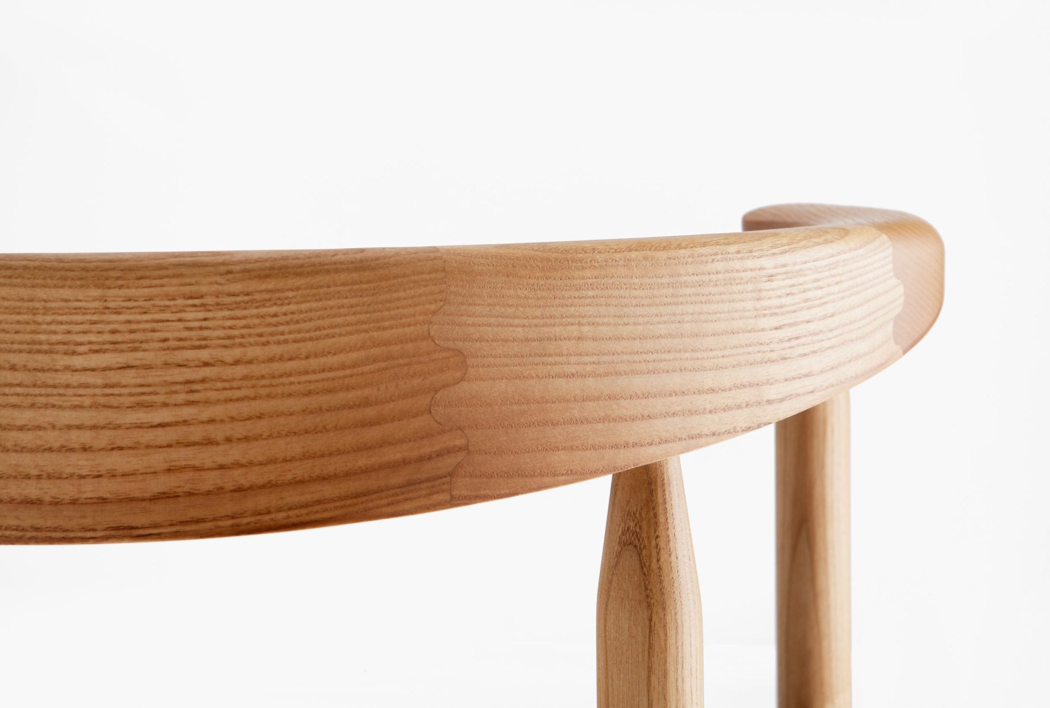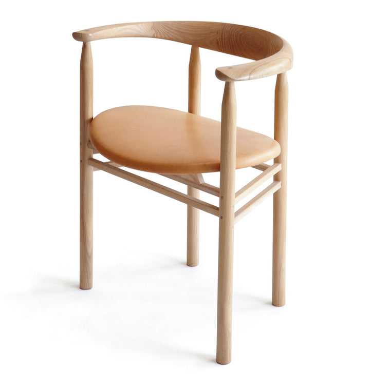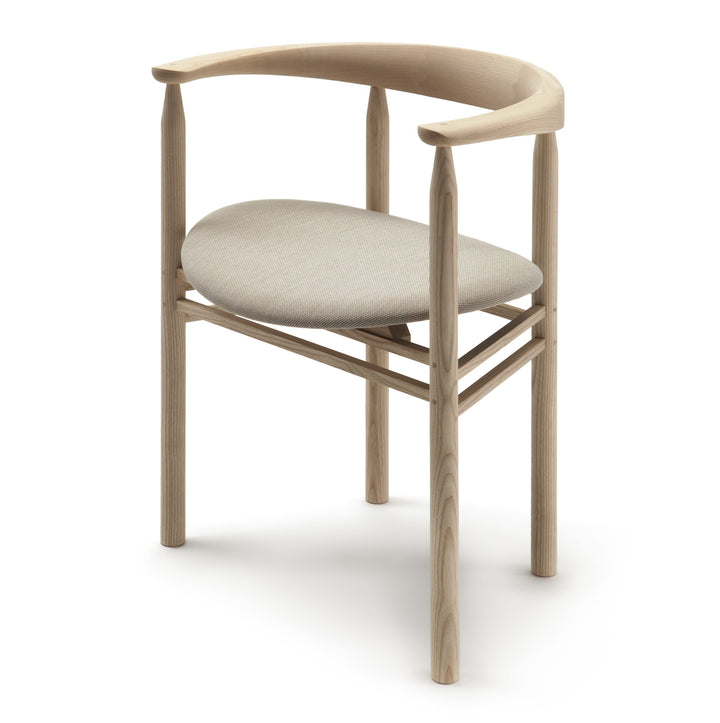 The Linea RMT6 chair was designed by master cabinetmaker Rudi Merz in 2011. Its most recognisable element is the distinctive, horseshoe-shaped back- and armrest that has been made using meticulously crafted finger joints. The chair is made of northern European ash with an oiled or stained finish. The wide, curved and upholstered seat ensures good seating comfort.