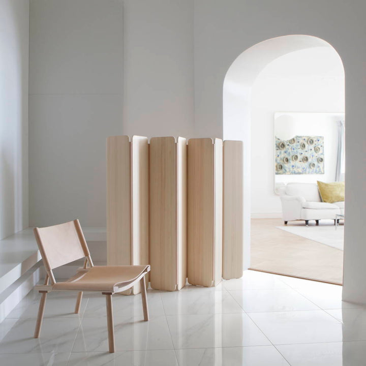 The simple and carefully detailed Separat space divider lets the wooden surfaces speak. The clever natural tanned leather hinge grows old together with the wooden components, creating a beautiful patina.