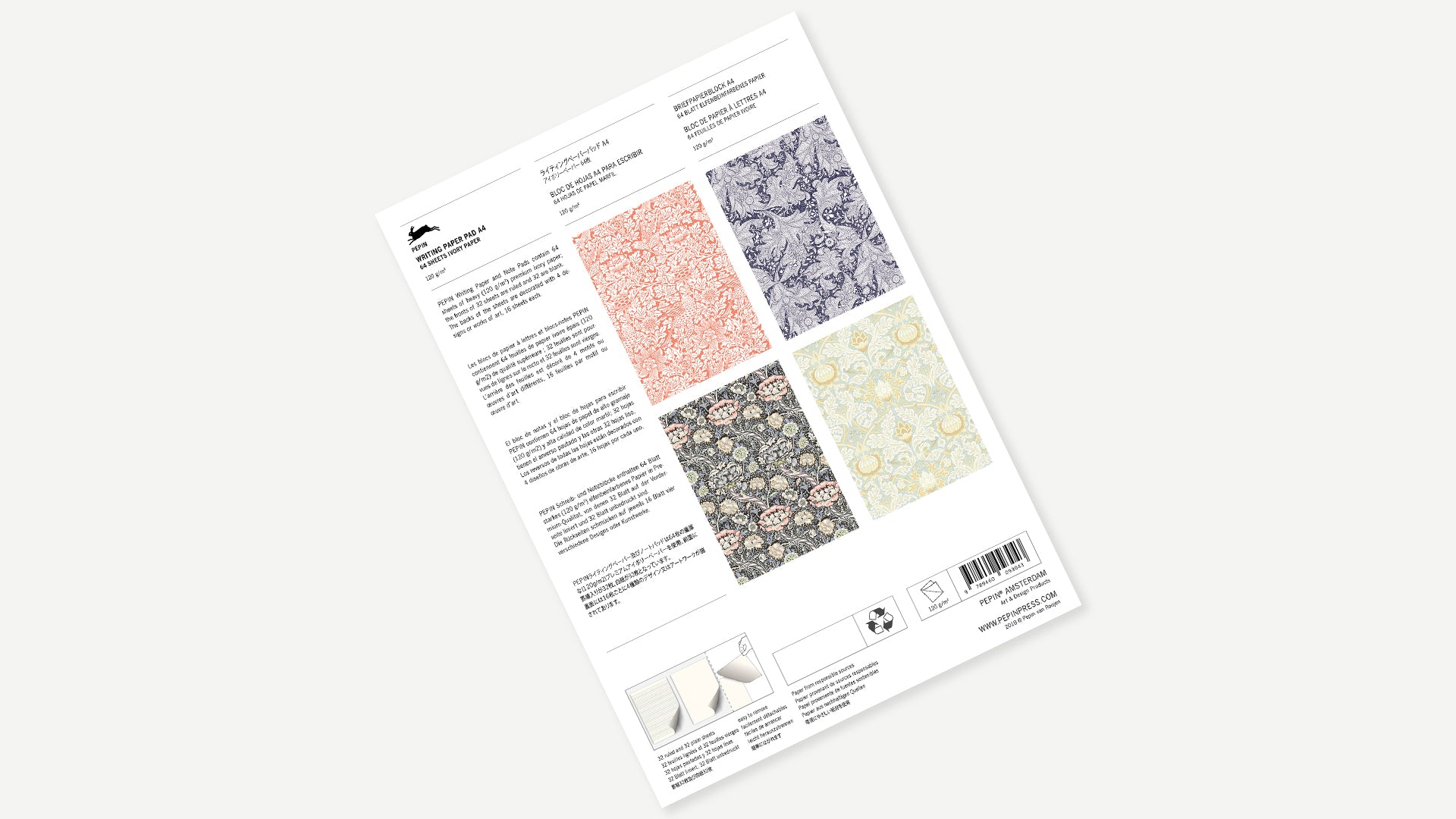 PEPIN Writing Paper Pads (A4) hold 64 sheets of 120 g/m2 premium ivory paper, half of which are ruled and half blank so they can be used for hand writing, drawing as well as for running through a printer. The reverse of the sheets are decorated with 4 different designs per pad, 16 sheets each. The Writing Pads are available in a range of styles in either A4 or A5 format. Separately, matching DL or C6 envelope packs are also available featuring complimentary designs.