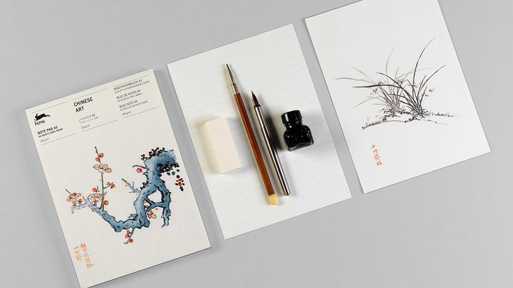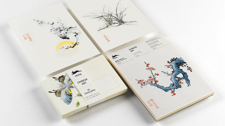 PEPIN Writing Pads hold 64 sheets of 120 g/m2 premium ivory paper, half of which are ruled and half blank so they can be used for hand writing, drawing as well as for running through a printer. The reverse of the sheets are decorated with 4 different designs per pad, 16 sheets each. The Writing Pads are available in a range of styles in either A4 or A5 format. Separately, matching DL or C6 envelope packs are also available featuring complimentary designs.
