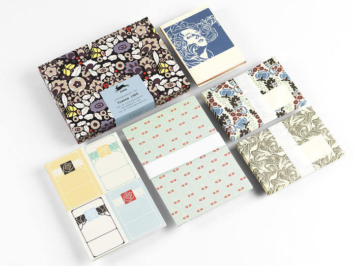 40 sheets (A5), 20 envelopes (C6), 8 greeting cards (A5 folded to A6) and 30 stickers and labels