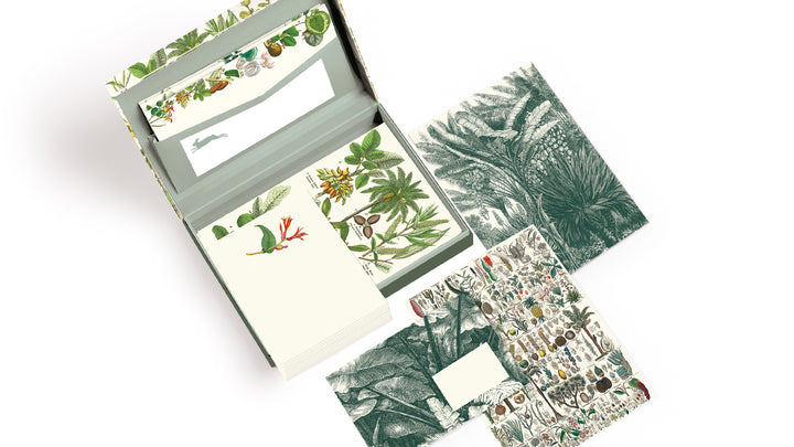 The Letter Writing Set box contains 10 sheets of 4 different designs (printed on one side), so 40 sheets in all of A5 writing paper (150x210mm/6”x8¼”). Included are 40 matching envelopes (20 x 2 designs) and 50 assorted stickers and labels. Sheets, envelopes and stickers can be used in combination or independently.
