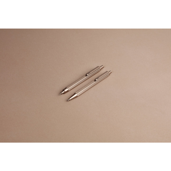 Brushed aluminum hexagonal body, for standard 0.5 mm graphite leads, retractable steel barrel, eraser under the push button, comes in a cardboard box with window