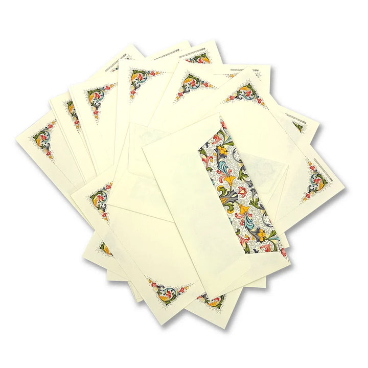 Hand pressed in Florence Italy, of 100% cotton paper. This traditional stationery with gothic Florentine decorations, is ideal to send out unforgettable notes.