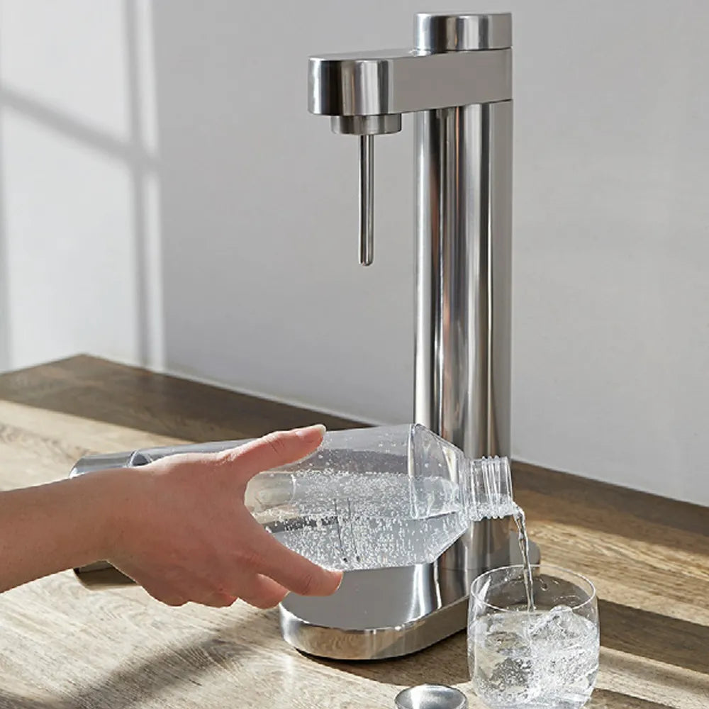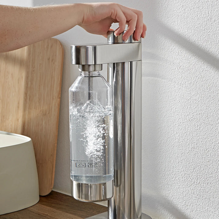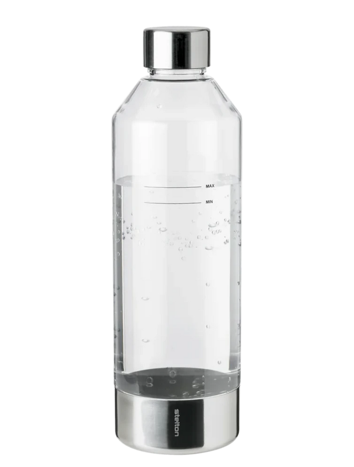 A streamlined bottle specially developed to fit the design and function of the Brus carbonator The bottle is made of PET plastic and features a lid and base in stainless steel for an elegant look. The bottle is BPA-free and contains no harmful toxins. The Brus carbonator is only suitable for use with the Brus bottle included. No other bottles may be used. The bottle is marked with a MAX fill line to prevent the water from overflowing when water is carbonated. Max: 0.84 l. Stelton recommends that bottles for the Brus carbonator be replaced after two years to ensure function and hygiene. The Brus bottle is not dishwasher safe, but can be washed by hand using a bottle cleaning brush.