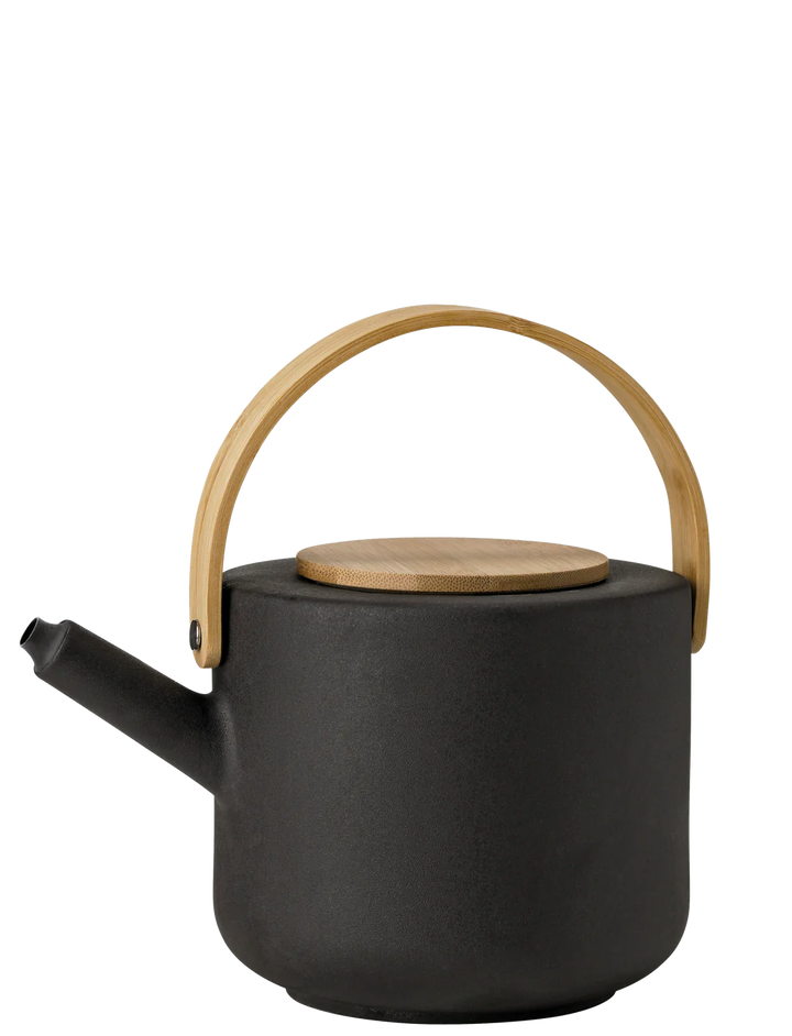 Tea time with Theo. The teapot looks great in blackish-brown, classic Scandinavian stoneware with a cast-iron finish. For a touch of Asian tea culture, the lid and handle are made of bamboo. The simplicity of the teapot is restful to the eye and lets you enjoy a peaceful moment and a nice cup of tea. The tea pot is designed by Francis Cayouette and holds 1.25 L.
