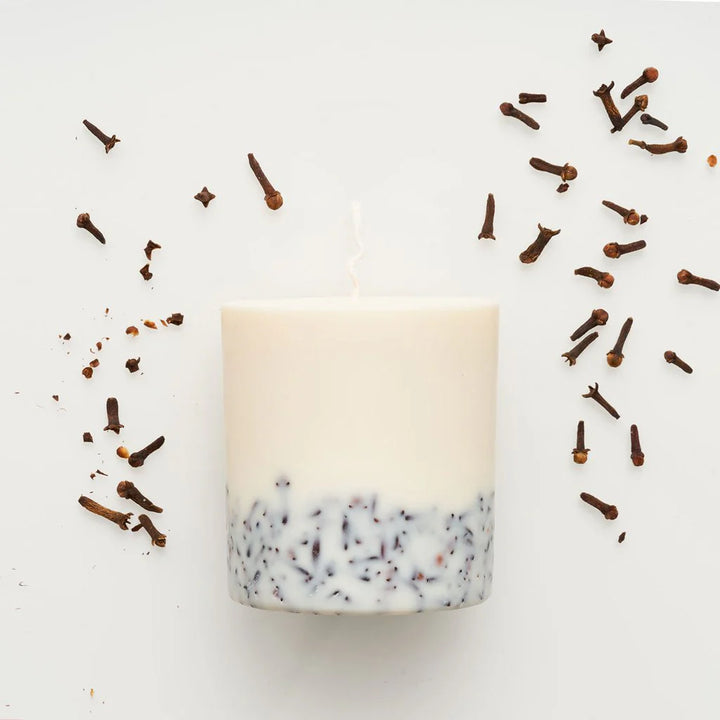 Warm, enwrapping ambience with just the strike of a match. Delicious. Hand poured soy wax candle decorated with cloves. Handmade using only natural soy wax and cloves & orange fragrance, cotton wick, and a glass votive with a wooden lid.