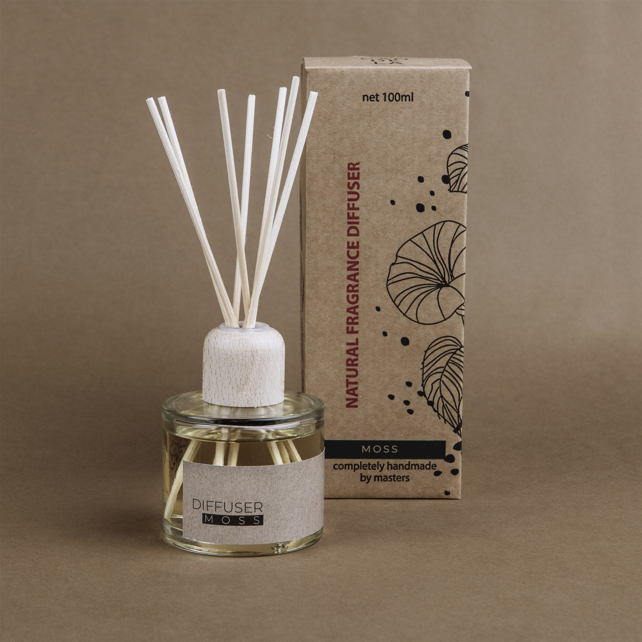 Hand poured natural moss diffuser using only natural fragrance, oil base, glass bottle, 7 rattan reed sticks and recyclable unbleached cardboard packaging.