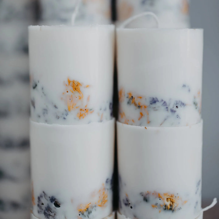 Hand-poured from a blend of soy and rapeseed wax, this botanical pillar candle is infused with a natural wild flowers fragrance and decorated with marigold and limonium petals. As it burns in a tunnel, the soft glow illuminates the flowers within, creating a stunning, nature-inspired centerpiece and a warm, uplifting atmosphere.