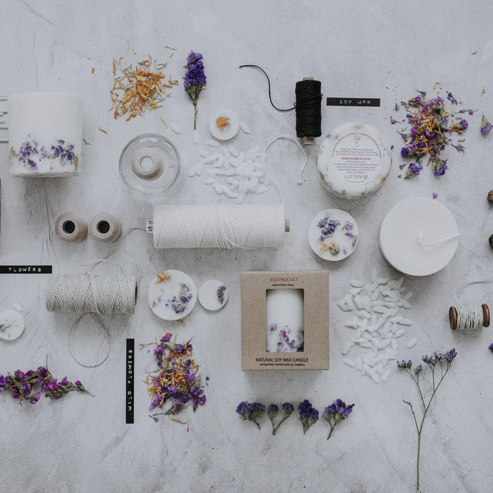 Hand-poured from a blend of soy and rapeseed wax, this botanical pillar candle is infused with a natural wild flowers fragrance and decorated with marigold and limonium petals. As it burns in a tunnel, the soft glow illuminates the flowers within, creating a stunning, nature-inspired centerpiece and a warm, uplifting atmosphere.