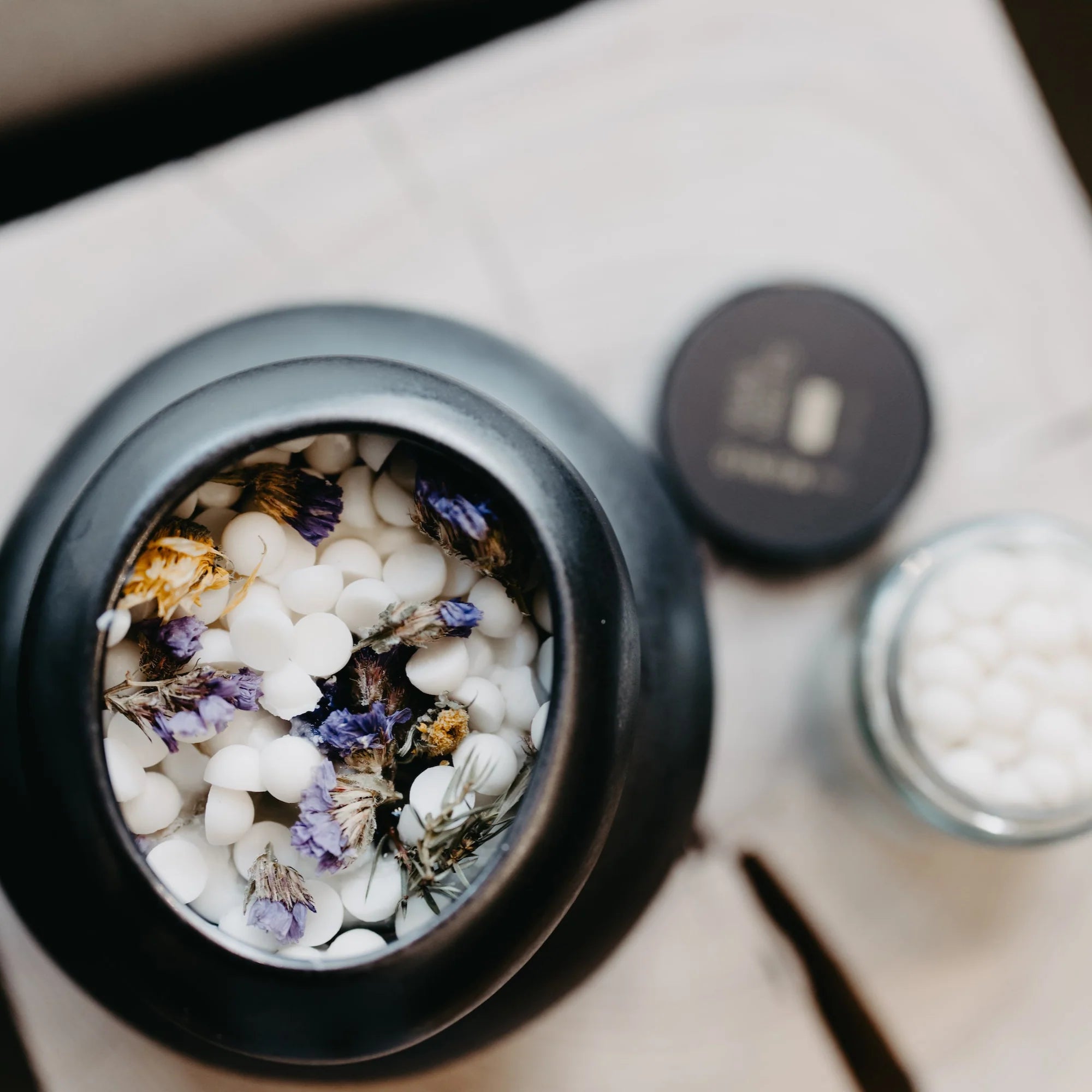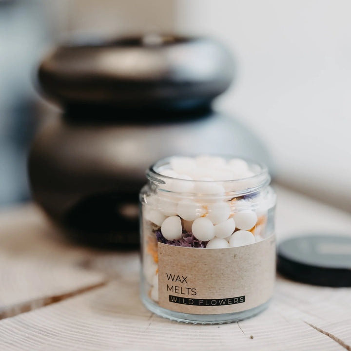 Handcrafted from a sustainable blend of soy and rapeseed wax, these scented wax melts are infused with natural wild flowers fragrance and decorated with marigold and limonium petals. Perfect for scenting drawers, closets, or small spaces, they can also be used in wax warmers for a more intensive aromatic experience.