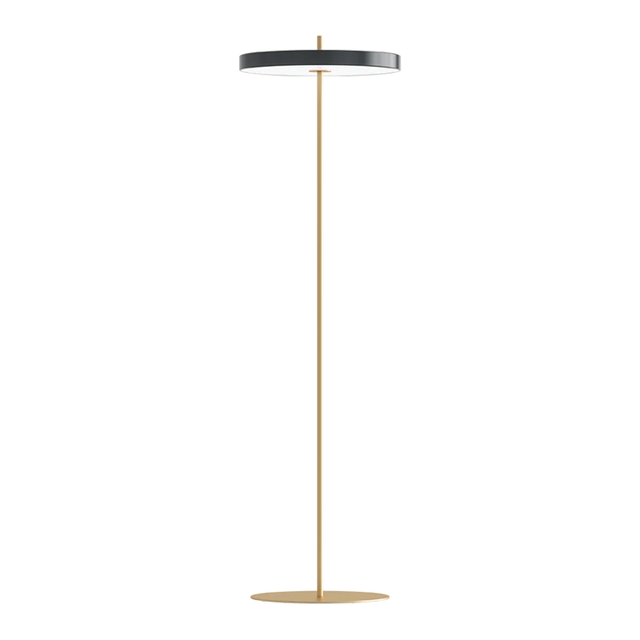 The LED panel is dimmable and has a white diffuser ensuring a soft illumination in the surrounding space. The brass stem going through the floor lamp as a vertical axis, reinforces a tight expression and by turning the top part of the stem you easily turn the light on and off.