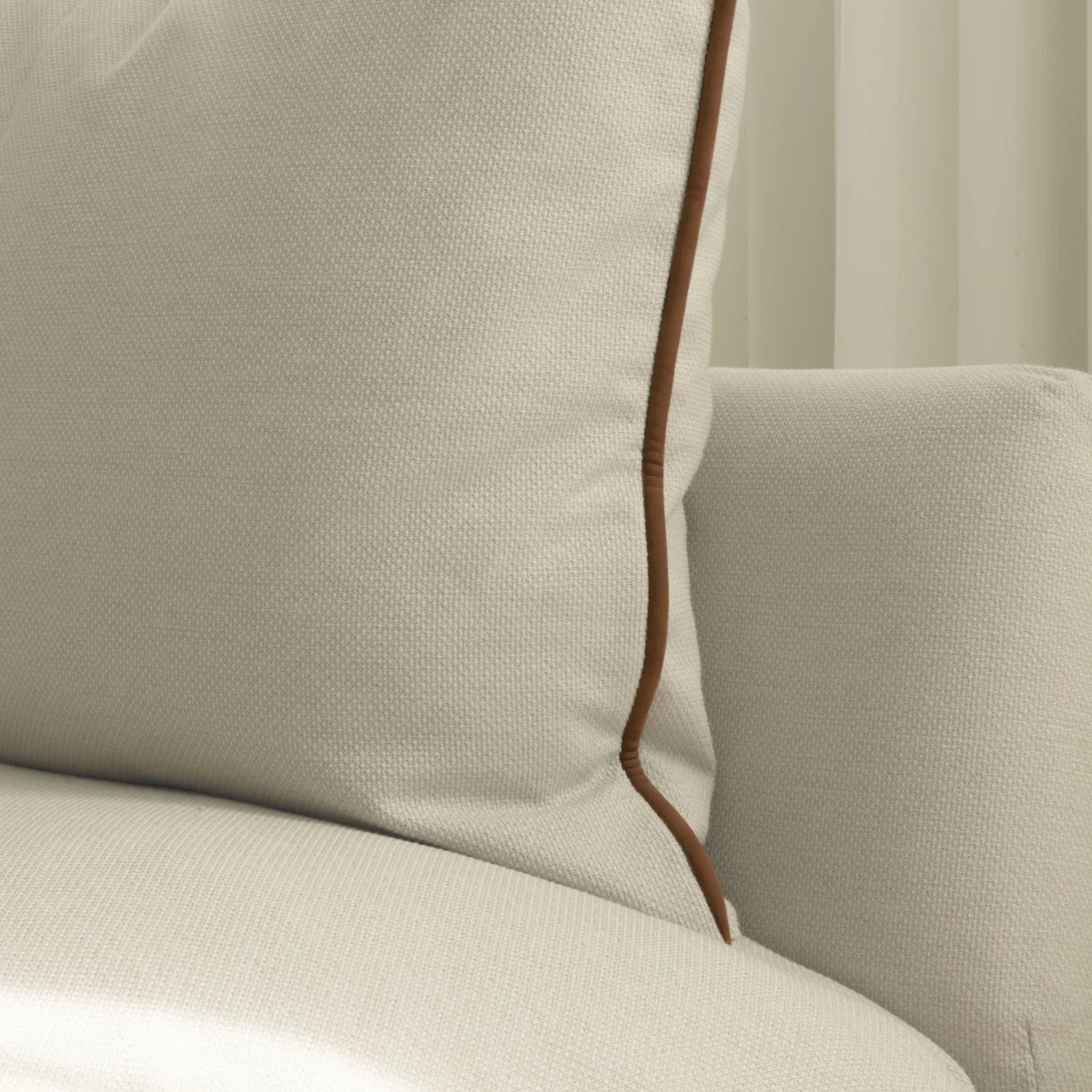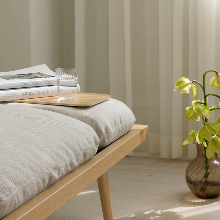 The narrow seat cushion has a thin tray on the reverse side, allowing you to set aside your coffee or laptop.