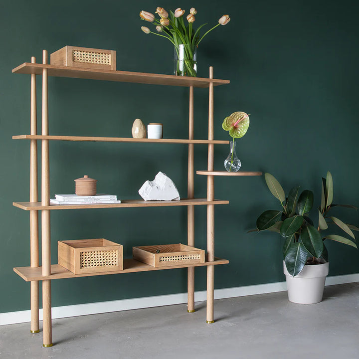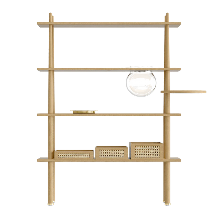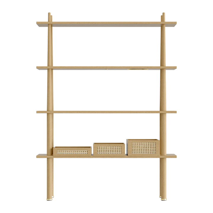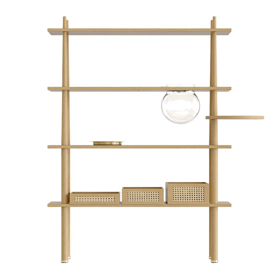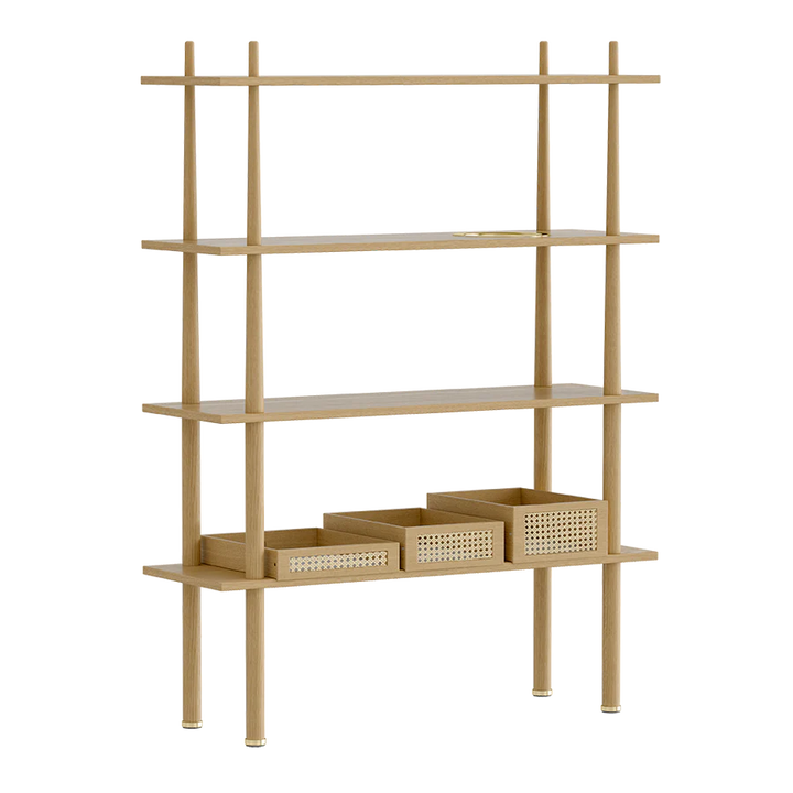 Stories is made from oak and has a simple visual attraction with its four conical legs that creates an agile and dainty appearance. The shelving system comes with four brass feet that can be adjusted and levelled to the slanting floors often seen in the old apartments of Copenhagen.