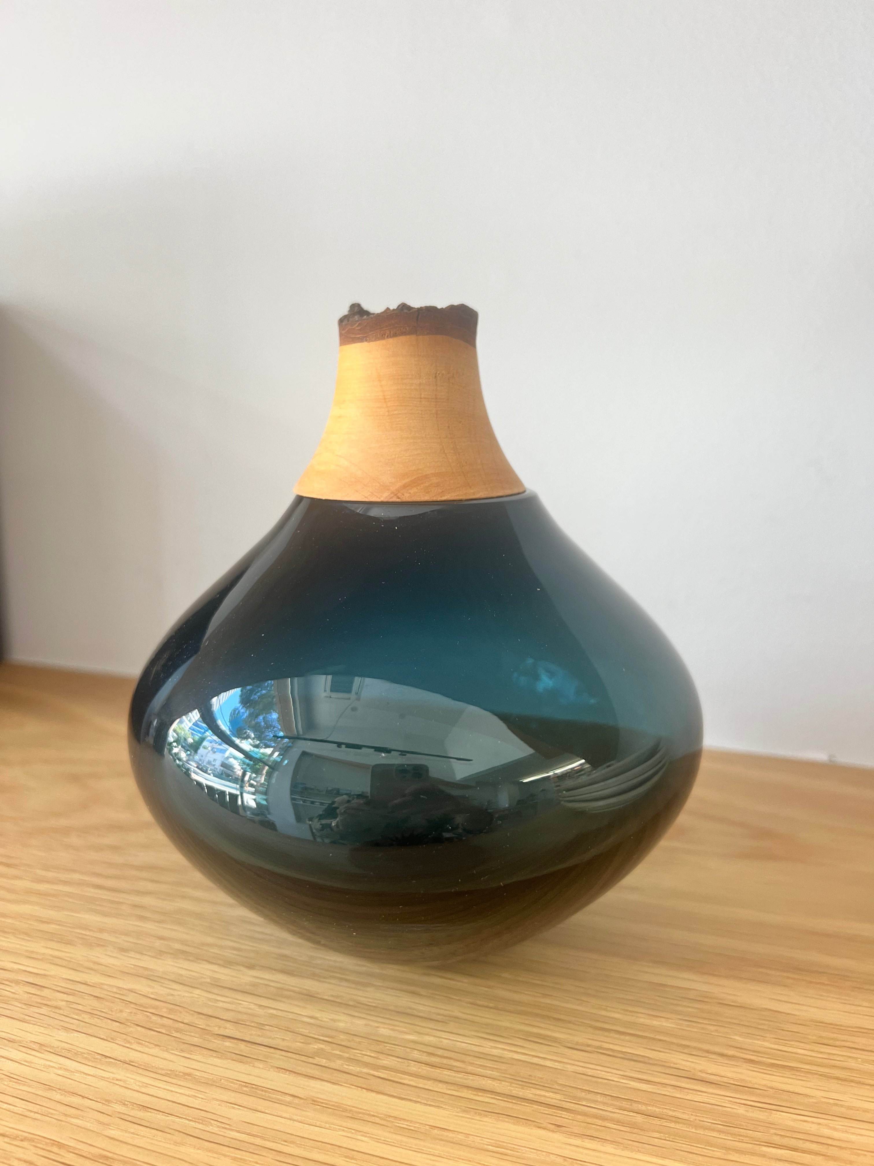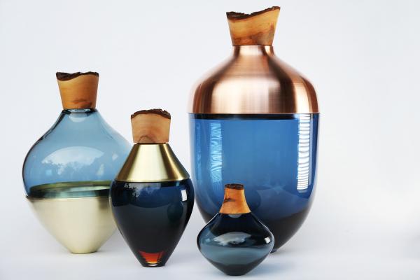 Handmade in Europe, by individual craftsmen: handblown glass (Czech Republic), hand spun metal (England), hand turned wood (Finland). The materials then come to our warehouse in North Germany where they are fitted and assembled.