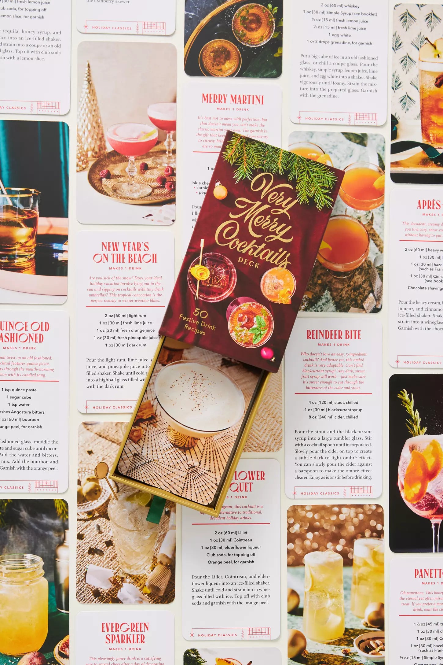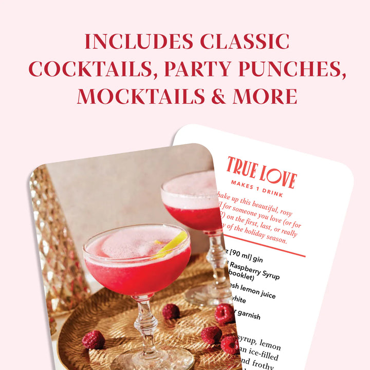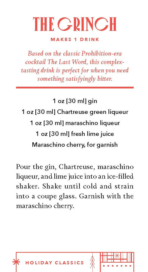 Each card in the deck features a delicious cocktail recipe and accompanying photo, and a helpful booklet includes tips for stocking your seasonal bar, garnishing your drinks, making flavored syrups, and more. A go-to gift for cocktail enthusiasts, hosts, merrymakers, and anyone who likes to entertain around the holidays, the Very Merry Cocktails Deck is sure to get even the grinchiest grinch in the festive spirit.