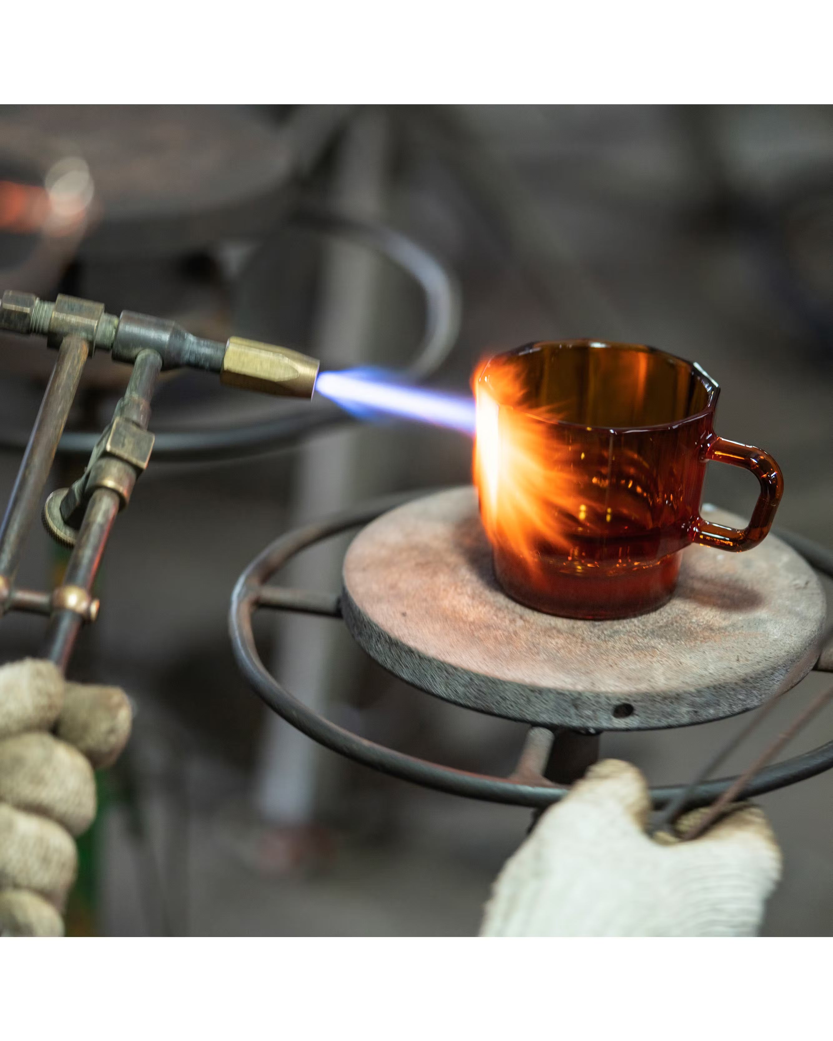 Utilizing glass-dyeing technique, W Glass is given unique colors, creating one-of-a-kind aesthetics through the inter-reaction of the glass, light, and contained beverage. W glass has a heat-proof handle, easy stacking tapered bottom, and smooth circular inner surface for easy cleaning. Savor a cup of coffee with more leisure and elegance, and enjoy the prospects of circular economy and environmental friendliness.